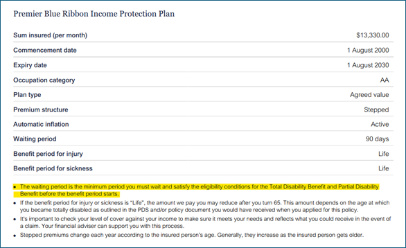 No concerns have been raised regarding waiting periods. Nonetheless, we have proactively provided additional clarification on these. All Income Protection Plans will now include the following disclosure on the insurance schedules/statements in the “Insurance details” section: